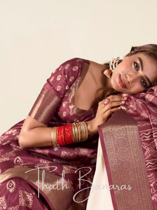 Wine Royale Mulmul Cotton Saree with Copper Zari Grandeur