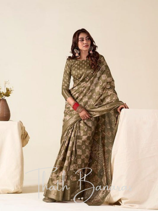 • Antique Gold Banarasi Jacquard Tissue Silk Saree with Zari Work