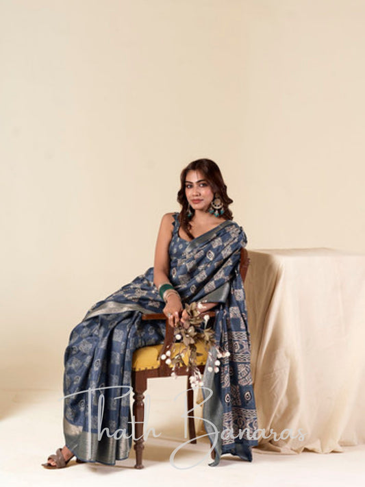 • Deep Navy MulMul Cotton Saree with Silver Zari Shimmer