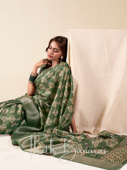 • Olive Envy Royal Green MulMul Cotton Saree with Zari Accents
