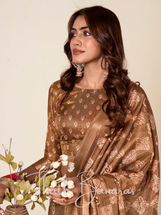 • Traditional Brown MulMul Cotton Saree with Royal Zari Highlights