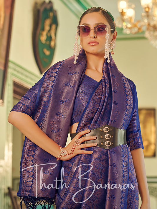 Deep blue Soft Handloom Weaving Silk with Copper Zari