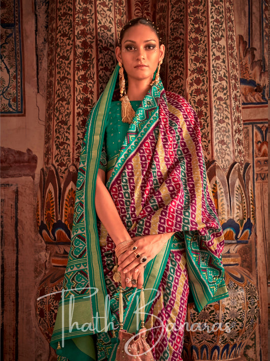 Multicolour Green Soft Cotton Silk Patola with red zari border