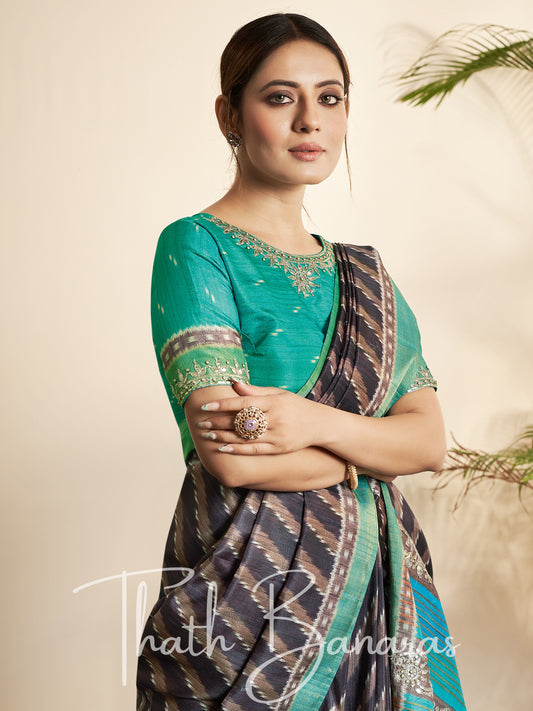 Cyan BlueTussar Silk Saree With Embroidered Blouse