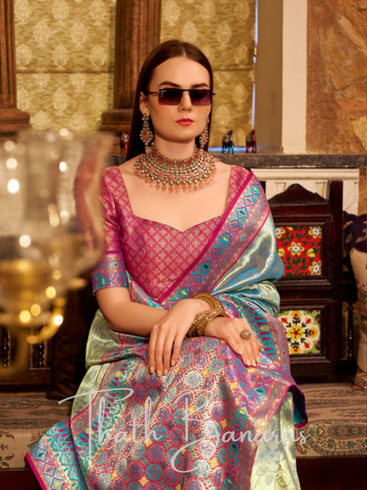 Sea Blue Poly Viscose Silk with Patola Print and Glory Finish