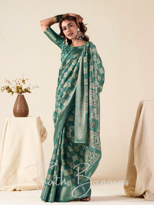Greenish Blue Teal MulMul Cotton Saree with Glorious Zari Work