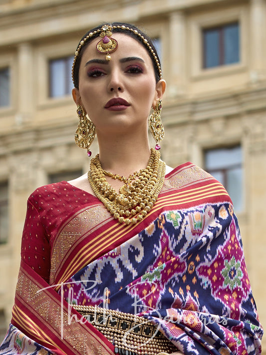 navy blue-red multicolor pure patola silk with paithani geometric pallu