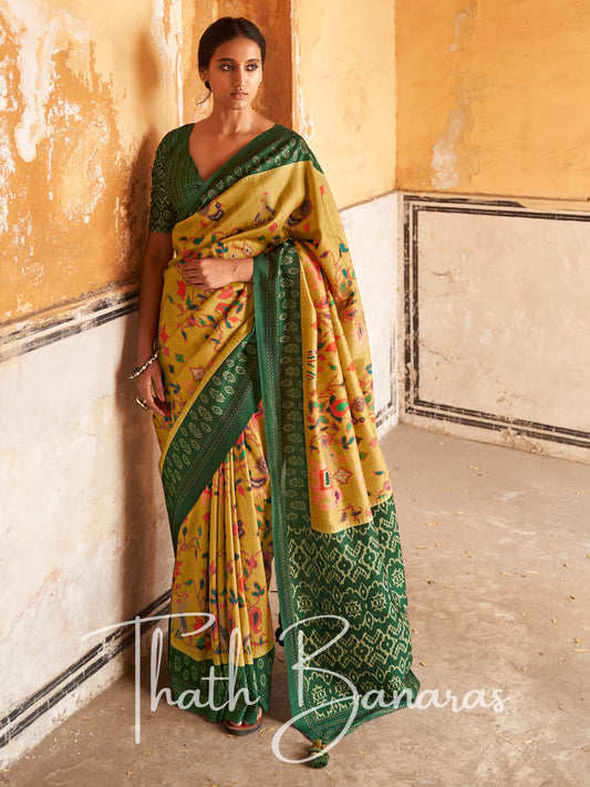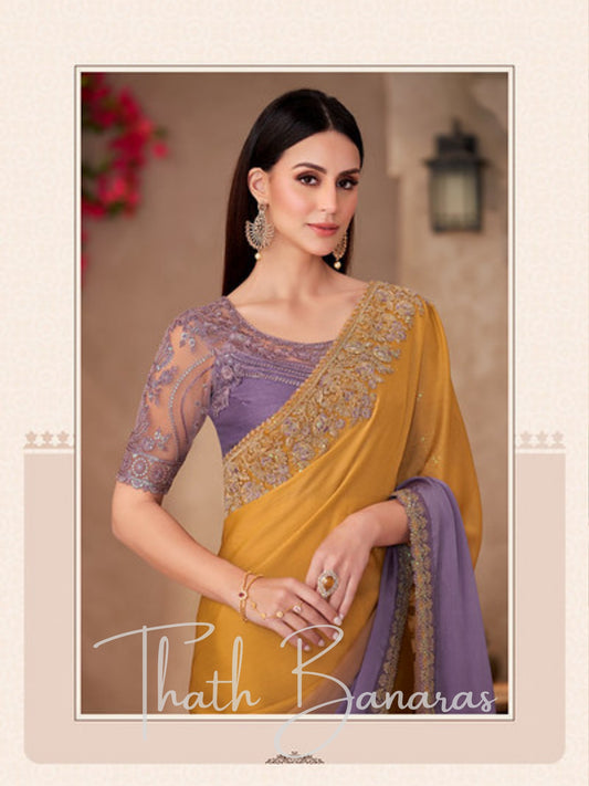 • Vibrant Yellow Purpel Saree with Zari and Embroidery work