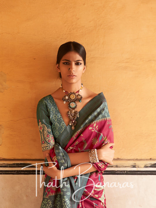 • Pink and Grey Tussar Silk Saree With Embroidered Blouse