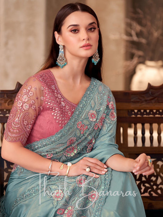 Elegant Sea Blue Floral Embroidered Designer Saree with Contrasting Pink Blouse