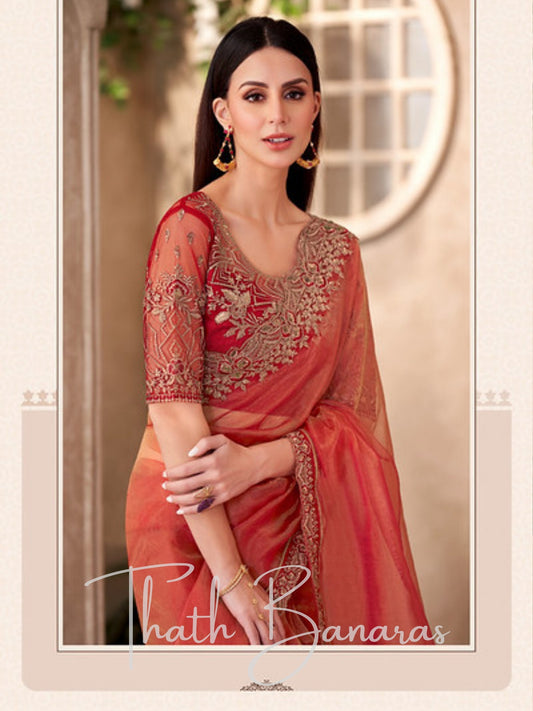 • Orange Tissue Traditional Saree with Embroidered Work.