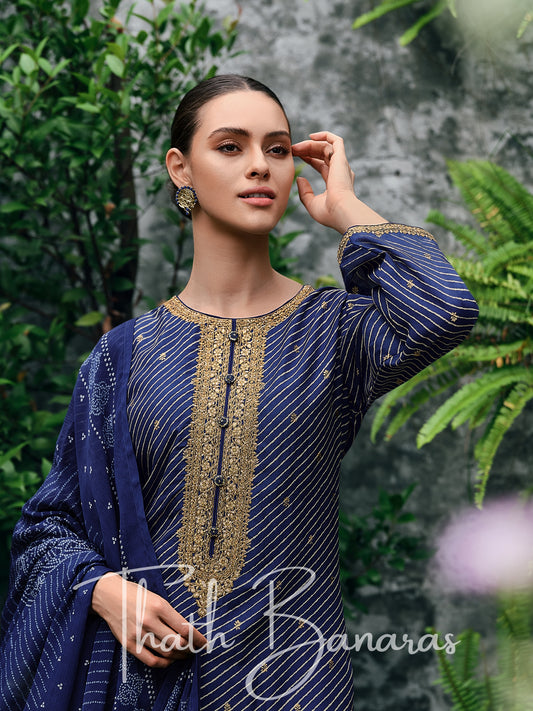 • Navy Blue Viscose Silk Rhapsody Salwar Suit with Lehriya Print & Embroidery, Cotton Silk & Digitally Printed Dupatta