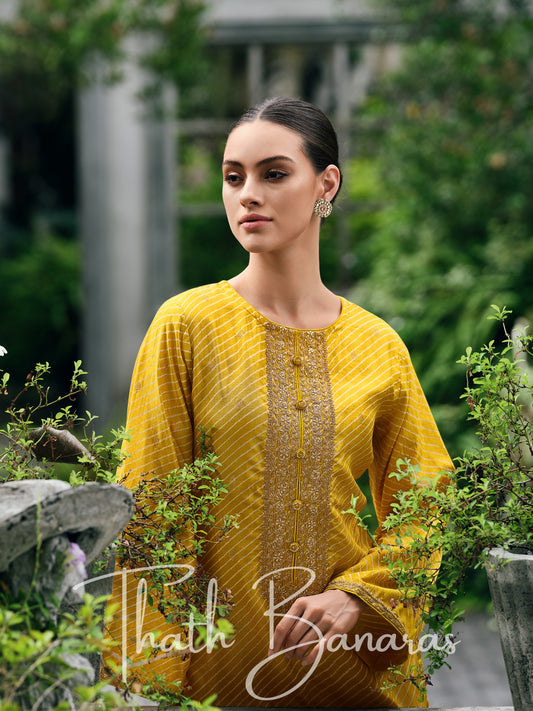 Mustard Yellow Viscose Silk Rhapsody Salwar Suit with Lehriya Print & Embroidery, Cotton Silk & Digitally Printed Dupatta