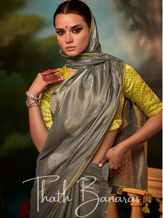 Antique Grey Fancy Fabric With Stitched Border with Designer Embroidery Worked Blouse