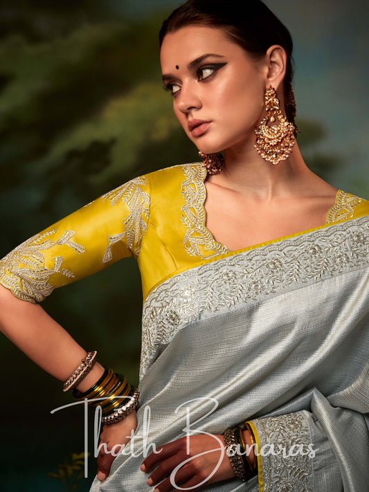 Silver Grey Fancy Fabric With Stitched Border with Designer Embroidery Worked Blouse