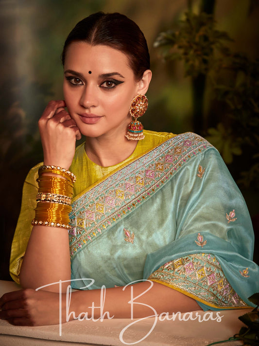 Mint Blue Soft Tissue Silk With Embroidery Thread Work Sequence & Digital Print