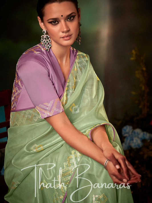 Grass Green Soft Tissue Silk With Embroidery Thread Work Sequence & Digital Print