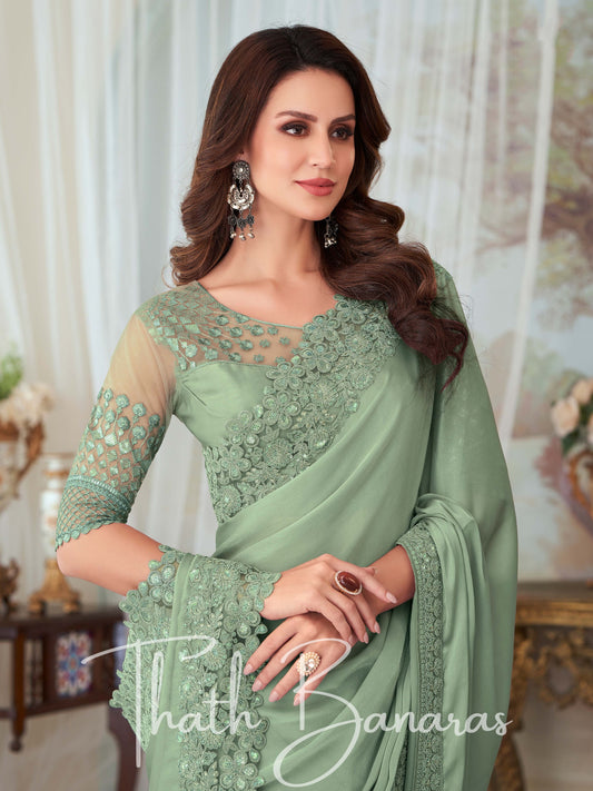 Light Turquoise Green Glorious Silk with Fancy Fabric Work
