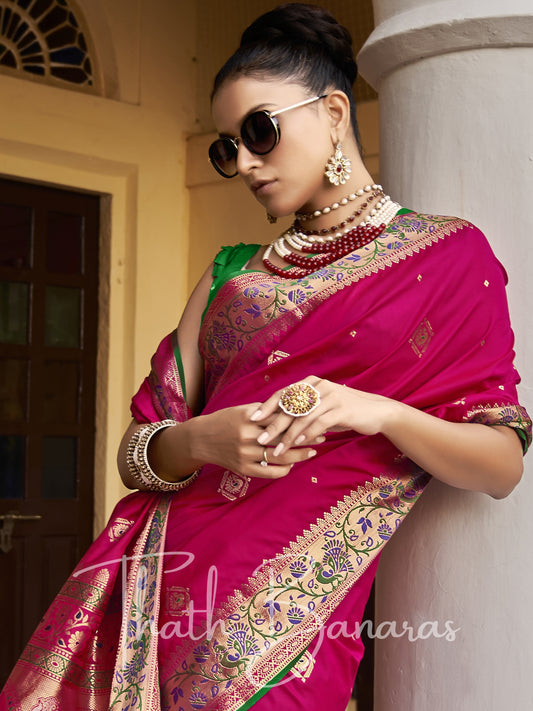 Magenta and green Soft Silk Weaving with contrast Blouse and Designer Pallu