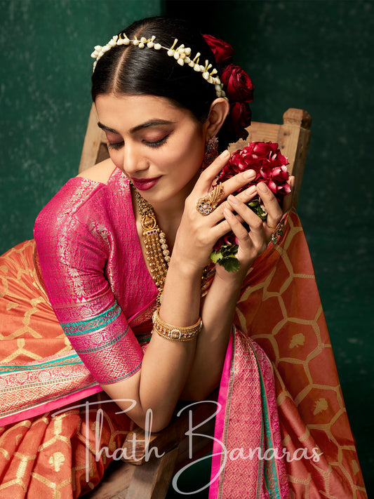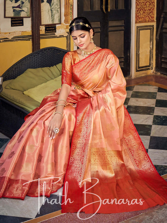 Rose Peach Gota Work Pure Kanchipuram Handloom Tissue Silk Saree