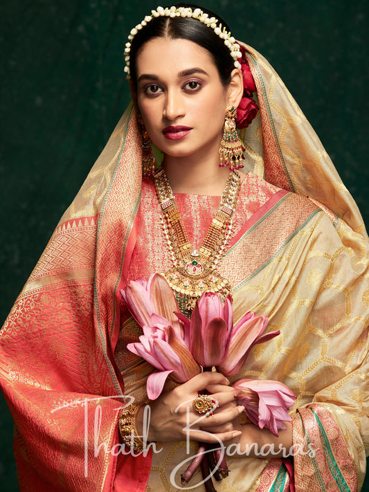 Brandy Cream Gota Work Pure Kanchipuram Handloom Tissue Silk Saree