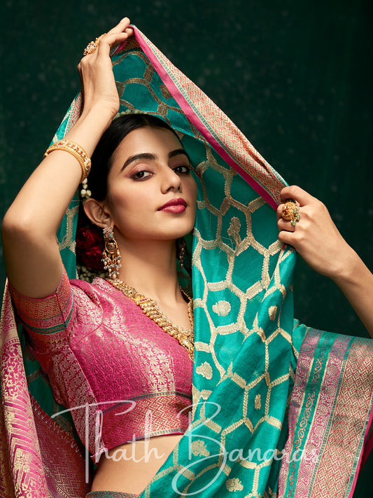 Teal Green And Hot Pink Designer Traditional Cotton Silk Broad Border Saree