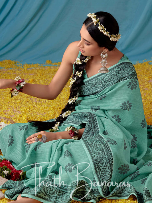Light Teal Green Beautiful Traditional Wear Lucknowi Linen