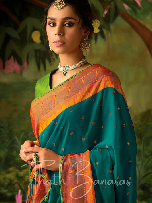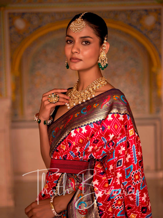 red-blue multicolor pure patola silk with paithani geometric pallu