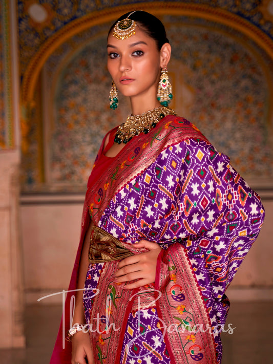 purple-red multicolor pure patola silk with paithani geometric pallu
