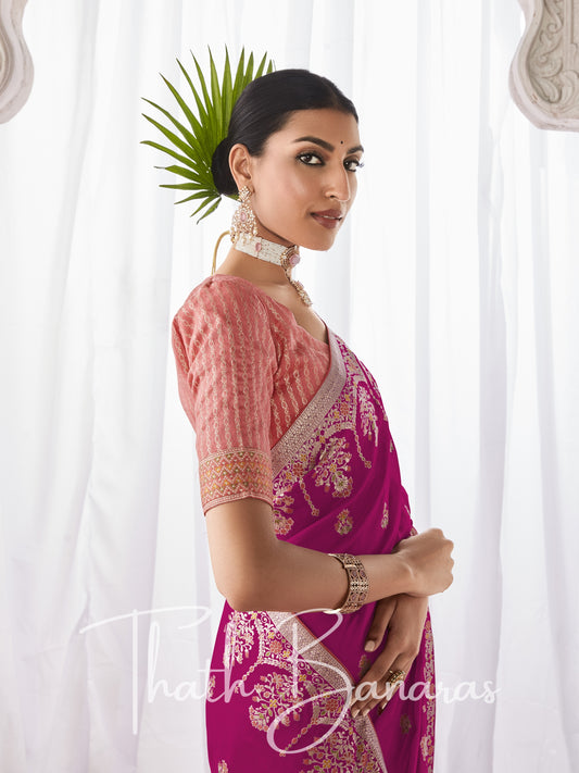 Magenta Pink Pure Crepe Zari Weaving Dola Silk With Tussales & Zari Weaving Blouse