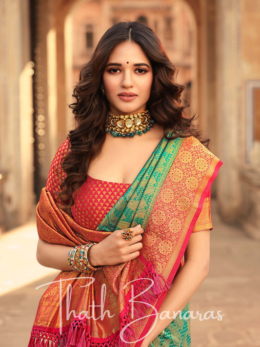 • Rama Green and Pink Soft Kanjivaram Chhap Dying Saree