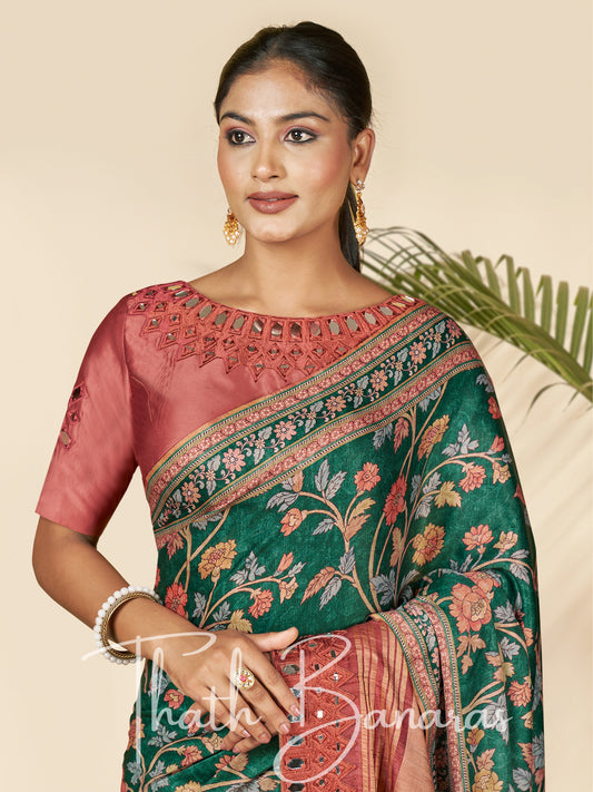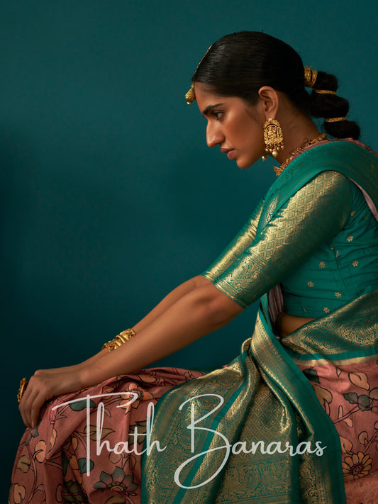 Almond Pink Soft Tusser Silk Digitle Printed Kalamkari Saree with Woven Border & Contrast Blouse
