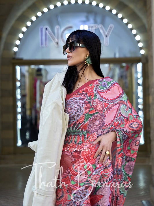 Dark Pink Viscose Woven Saree With Digitally Printed Viscosey Blouse