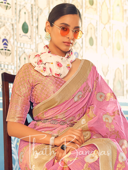 Pink Soft Handloom Weaving Silk with Copper Zari Saree