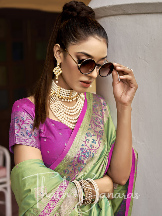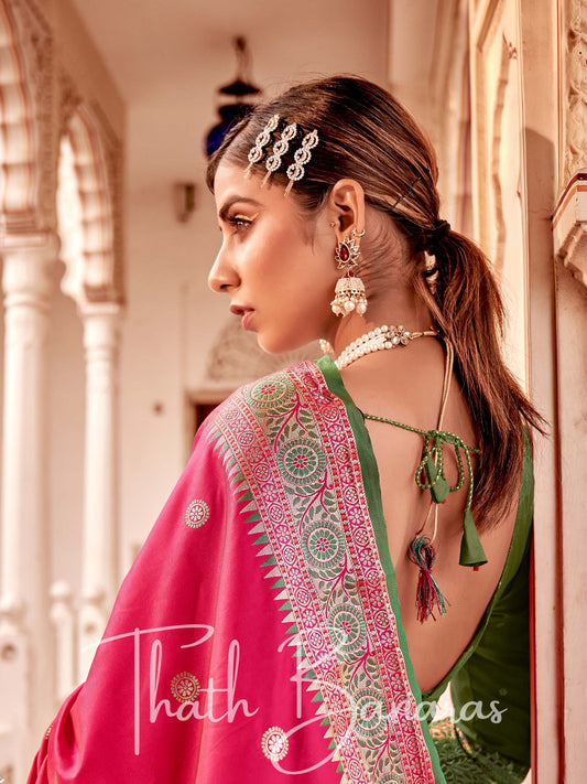 Green and pink Soft Silk Weaving with contrast Blouse and Designer Pallu