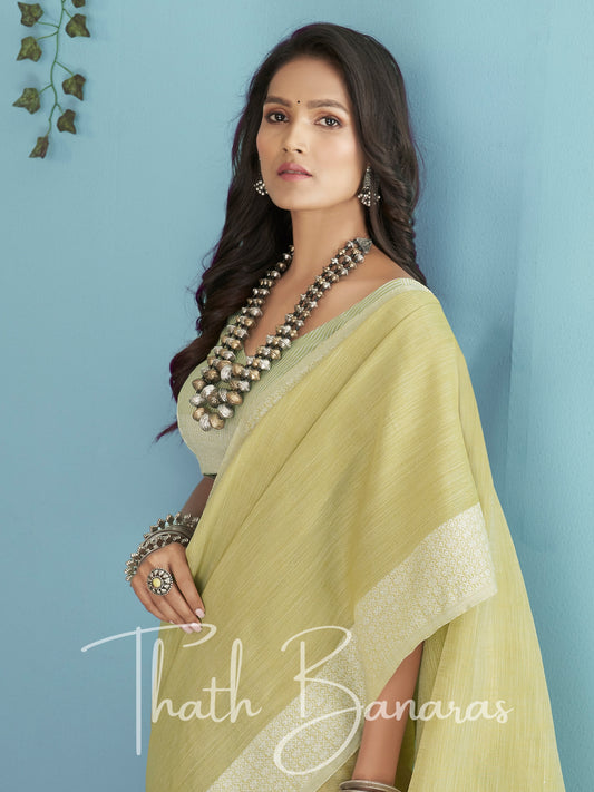 Olive green Soft Linen Silk with Chikhankhari Weaved Border