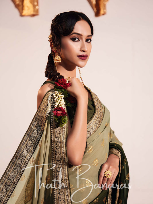 Forest Green and Light Grey Two Tone Heavy Georgette Fabric with Heavy Border