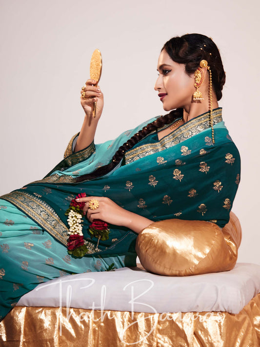 Greenish Blue Teal MulMul Cotton Saree with Glorious Zari Work