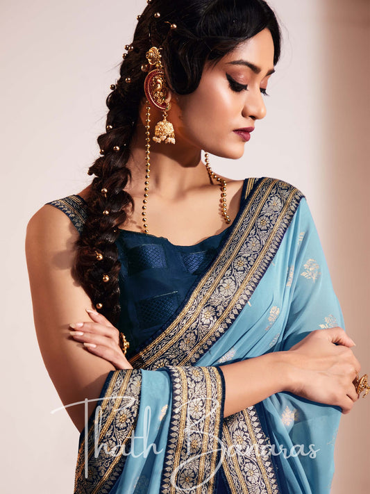 Teal Blue And Baby Blue Two Tone Heavy Georgette Fabric with Heavy Border
