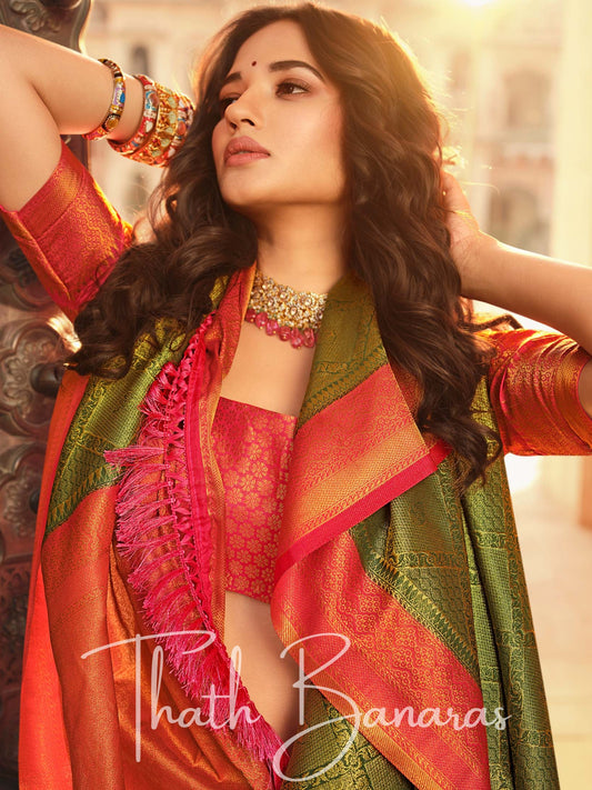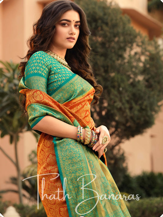 Orange and Rama Green Soft Kanjivaram Chhap Dying Saree