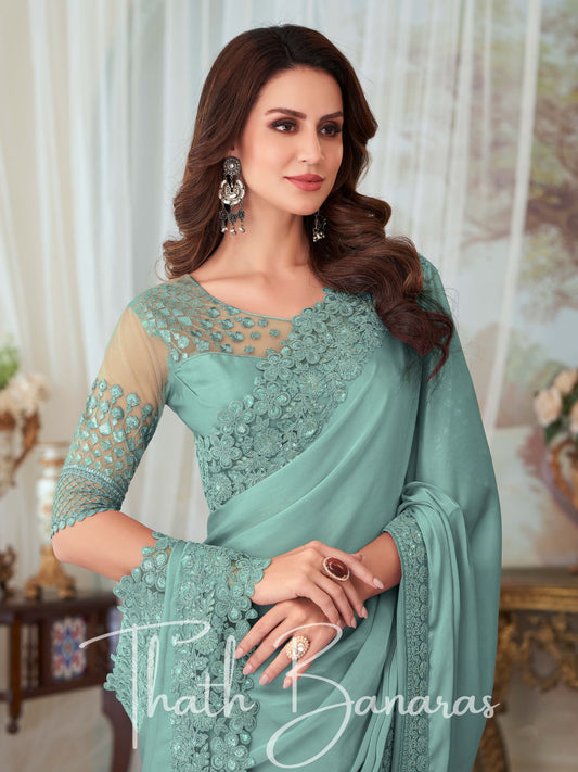 Light Turquoise Green Glorious Silk with Fancy Fabric Work