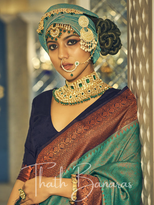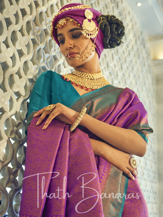 Royal blue and mellow white Soft Kanjiveram Silk with Silver Zari & Hand Dying