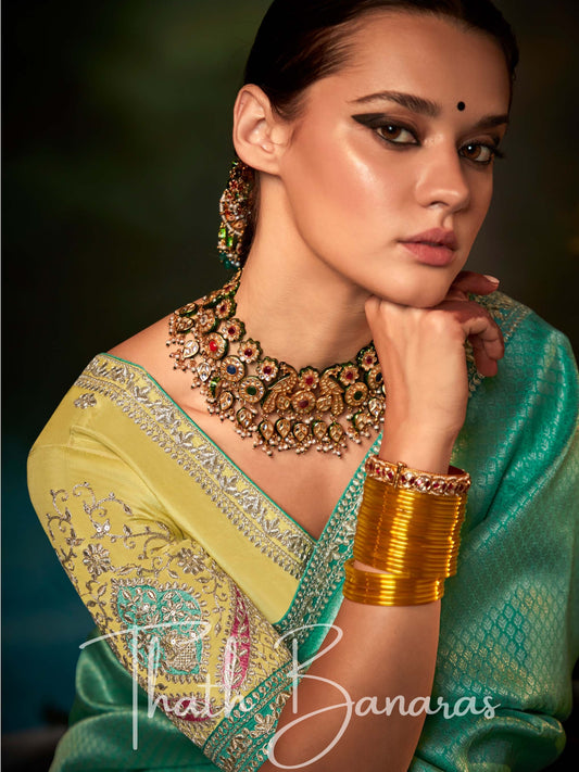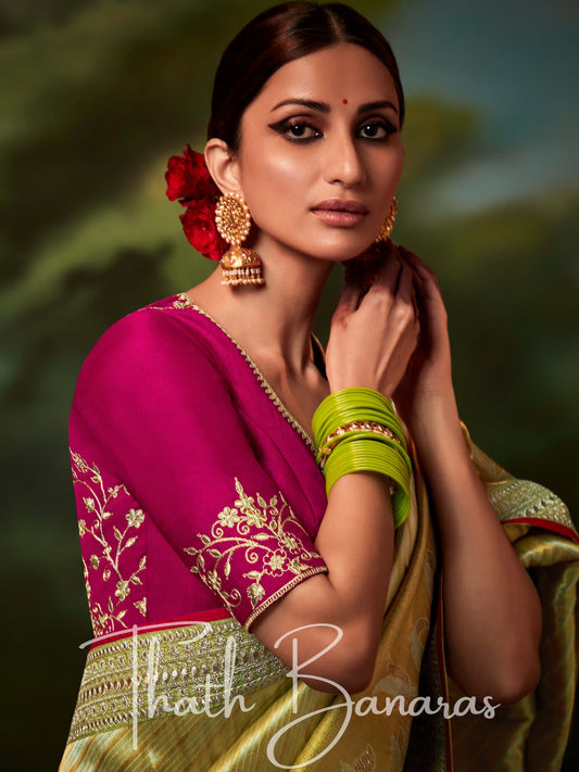 Green and Yellow Fancy Fabric With Stitched Border with Designer Embroidery Worked Blouse
