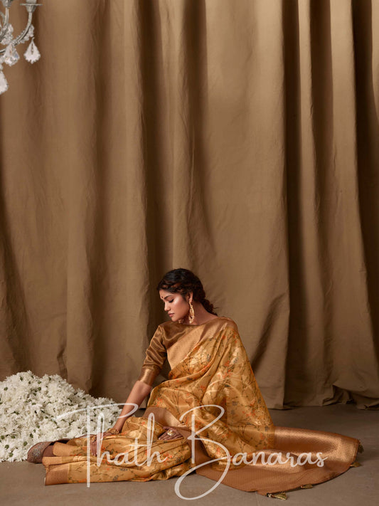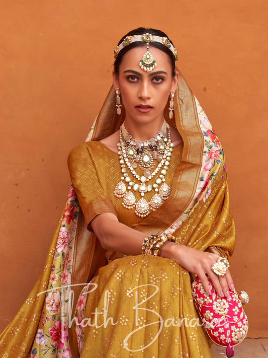 Mustard Yellow Viscose Silk with Zari Border and Floral Print