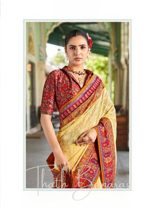 Yellow Georgette Lucknawi Saree with Exquisite Pashmina Foil Print