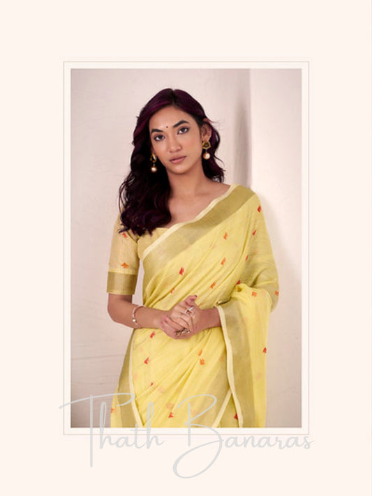 Mellow Yellow Soft Tissue Silk With Embroidery Thread Work Sequence & Digital Print