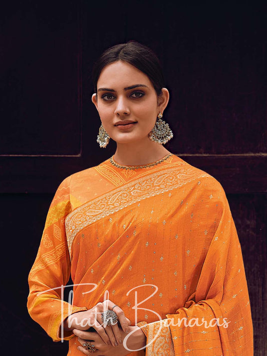 Yellow Lucknowi Georgette Saree with Pashmina Foil Print