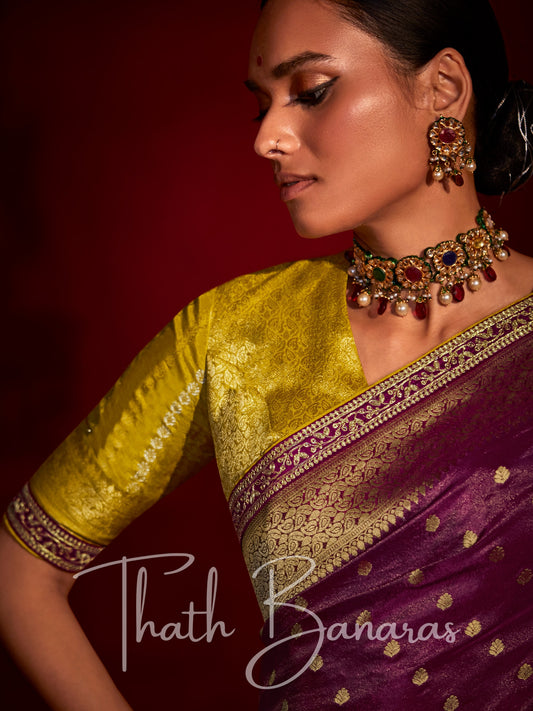 purple-yellow Khadi minakari saree with gold & silver ethnic zari embroidery