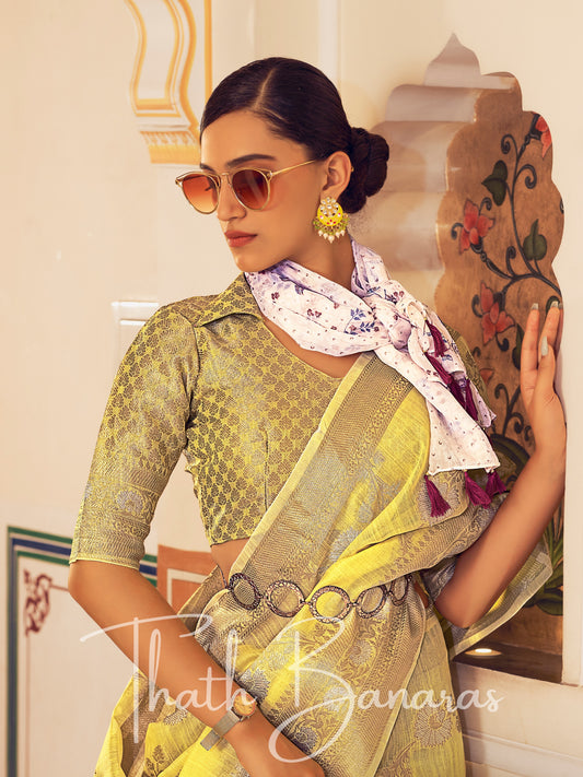 Lemon Yellow Stunning Beige Pure Linen Weaving Designer Saree