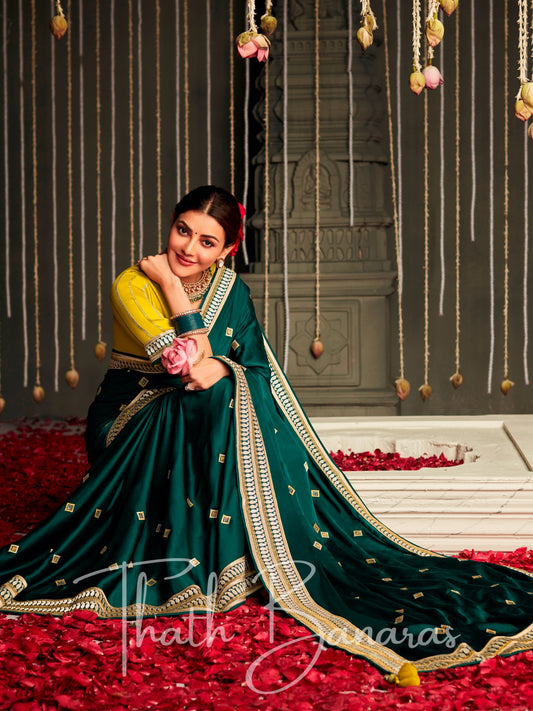 Forest green and lemon yellow Tissue Silk Fancy Fabric with Stitched Border and Designer Embroidery